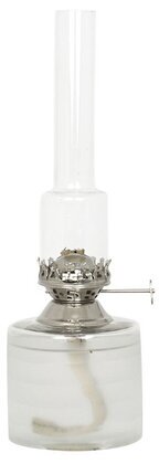 Vacker fotogenlampa i frostat glas med slipade ränder. Silverfärgad brännare och brännrör i klart glas, inklusive en veke. Finns i 3 olika storlekar.