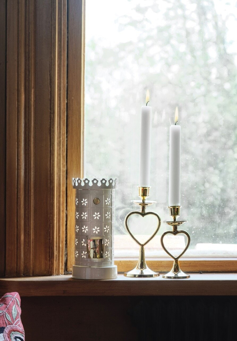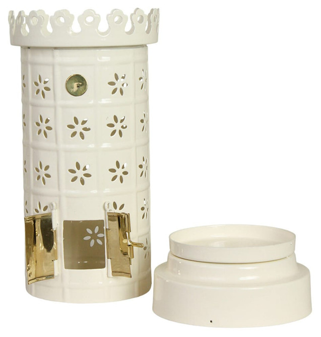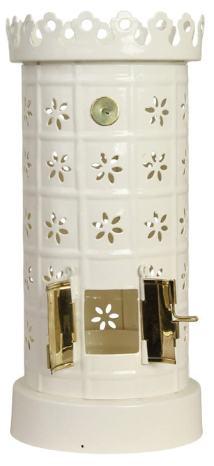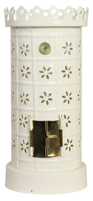 En dekorativ ljuslykta i vit plåt med utskurna blommönster som sprider ett varmt och stämningsfullt sken. Den är utformad som en liten kakelugn, där du enkelt lyfter av toppen för att placera värmeljuset inuti. De små mässingsdörrarna framtill blir en elegant detalj som förstärker känslan av klassisk kakelugn.
