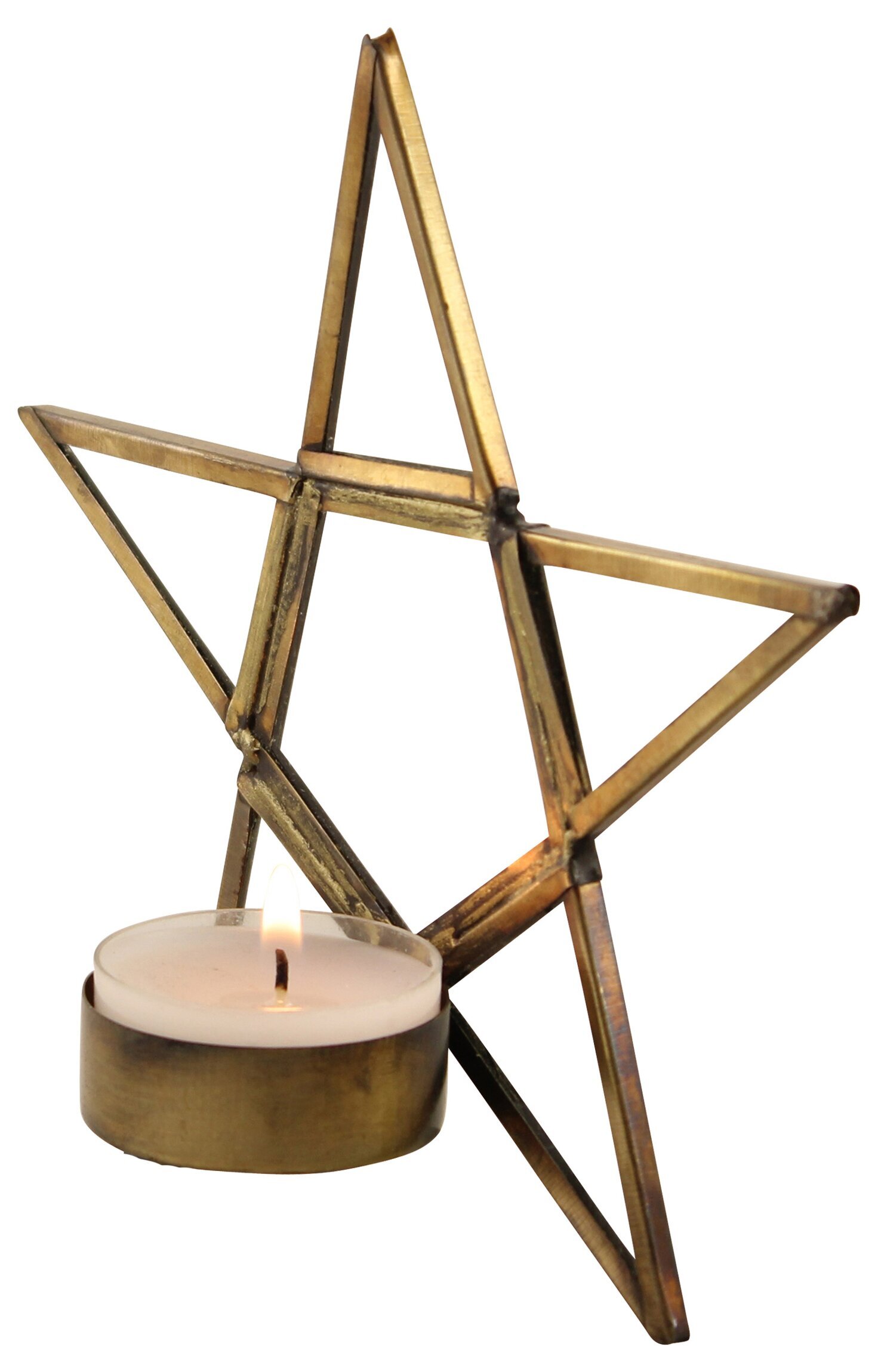Vacker stjärna med en liten värmeljusbehållare baktill. Stjärnan är tillverkad av plåt med antikmässing-finish & har mellan plåten glas vilket gör att stjärnan lyser upp med ett vackert & stämningsfullt sken. Mått: 13,5 x 4,5 x 13,5 cm.