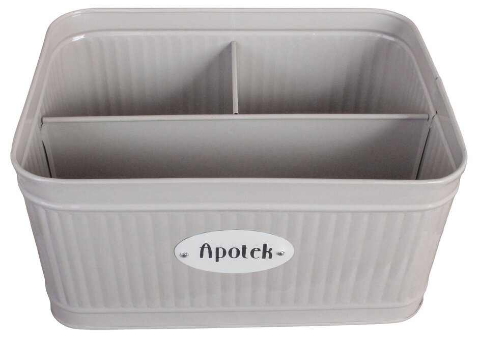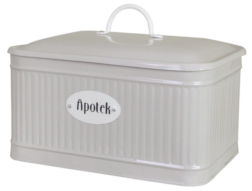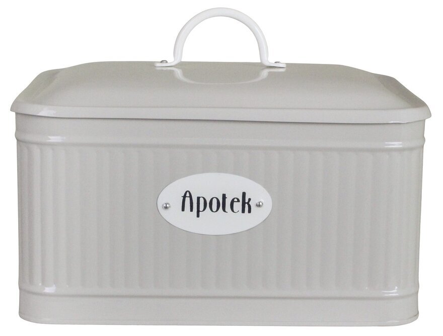 Vacker och praktisk plåtburk med texten Apotek, perfekt för att samla mediciner, plåster och andra små nödvändigheter på ett och samma ställe. Locket öppnas enkelt och har ett vitt handtag som gör det smidigt att lyfta av. Inuti burken finns fasta fack som hjälper dig att hålla ordning, utan lösa delar som kan komma bort.