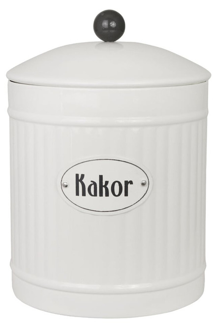 En charmig plåtburk med klassisk känsla – perfekt för förvaring av kakor, småkakor eller annat gott. Den vita burken har en stilren, lantlig design med räfflad yta, rund form och ett dekorativt lock med svart knopp. Texten Kakor på framsidan gör burken både praktisk och fin att ha framme på köksbänken.