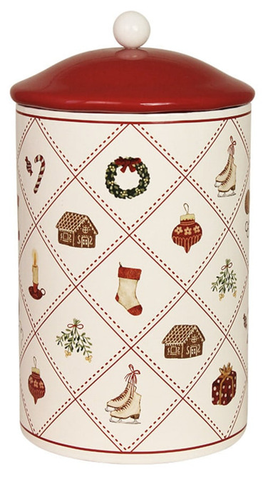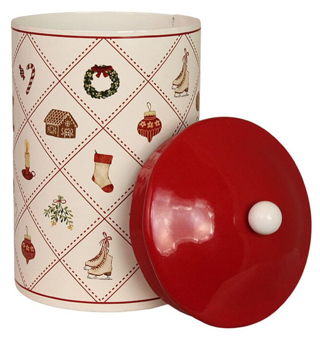 En charmig förvaringsburk i plåt med klassiska julmotiv och rött lock. Perfekt för pepparkakor, småkakor eller julgodis – men lika fin att använda till andra småsaker i köket. Den dekorativa designen sprider härlig julstämning och blir en vacker detalj på köksbänken eller hyllan.