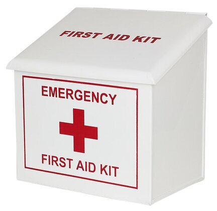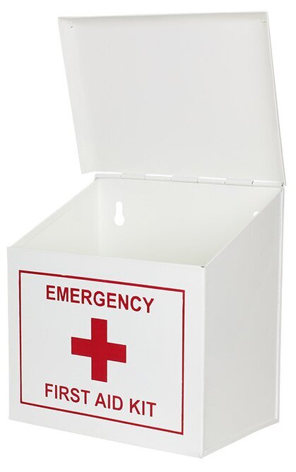 Plåtbox att sätta på väggen med öppningsbart lock för hemmets lilla apotek såsom medicin, plåster, bandage mm.