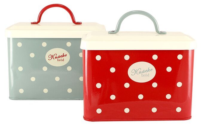 Framträdande på bilden är två rektangulära plåtburkar med ett klassiskt och retroinspirerat utseende. Den burk som står längst fram är röd med ett mönster av vita prickar, vilket ger den en livlig och inbjudande estetisk effekt. På framsidan av burken finns en oval vit etikett med texten "Knäckebröd", vilket tydligt anger dess tilltänkta användningsområde.