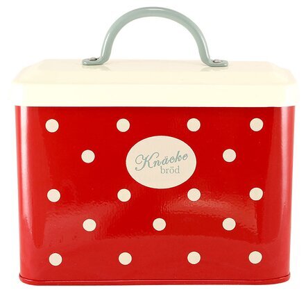 Förvara ditt knäckebröd i denna stilfulla plåtburk som har en gammeldags rustik stil. Plåtburken har en röd bakgrund, vita prickar samt gröna detaljer. Mått:17,5 x 7,5 x 13,5 cm.