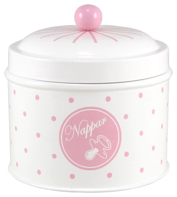 Plåtburken från Strömshaga visar på en elegant enkelhet som passar perfekt för att förvara nappar på ett organiserat sätt. Den kan enkelt placeras i barnrummet eller i köket, tack vare sin mångsidiga design. Den kan också bli ett iögonfallande inslag på en hylla eller ett bord, vilket gör den till mer än bara en praktisk förvaringslösning.