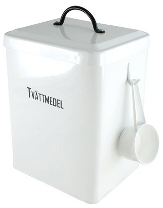 På sidan av plåtburken hänger en vit doseringsskopa. Skopan är praktiskt placerad, alltid nära till hands, för att kunna mäta upp rätt mängd tvättmedel vid varje tvättillfälle. Att ha skopan integrerad på detta vis förbättrar användarvänligheten och minimerar risken för spill.