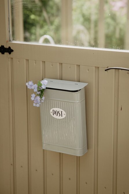 Fint placerad i postlådans övre del finns en kvist av blå blommor som hänger ned och adderar en frisk, naturlig detalj som mjukar upp de något hårdare linjerna i metallen. Denna blomdetalj samverkar med den omgivande gröna trädgården som skymtas genom glasrutorna i dörrens övre del. Utomhusmiljön skapar en känsla av fridfullhet och kompletterar den lantliga estetiken på ett smakfullt sätt.