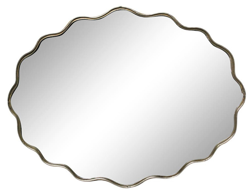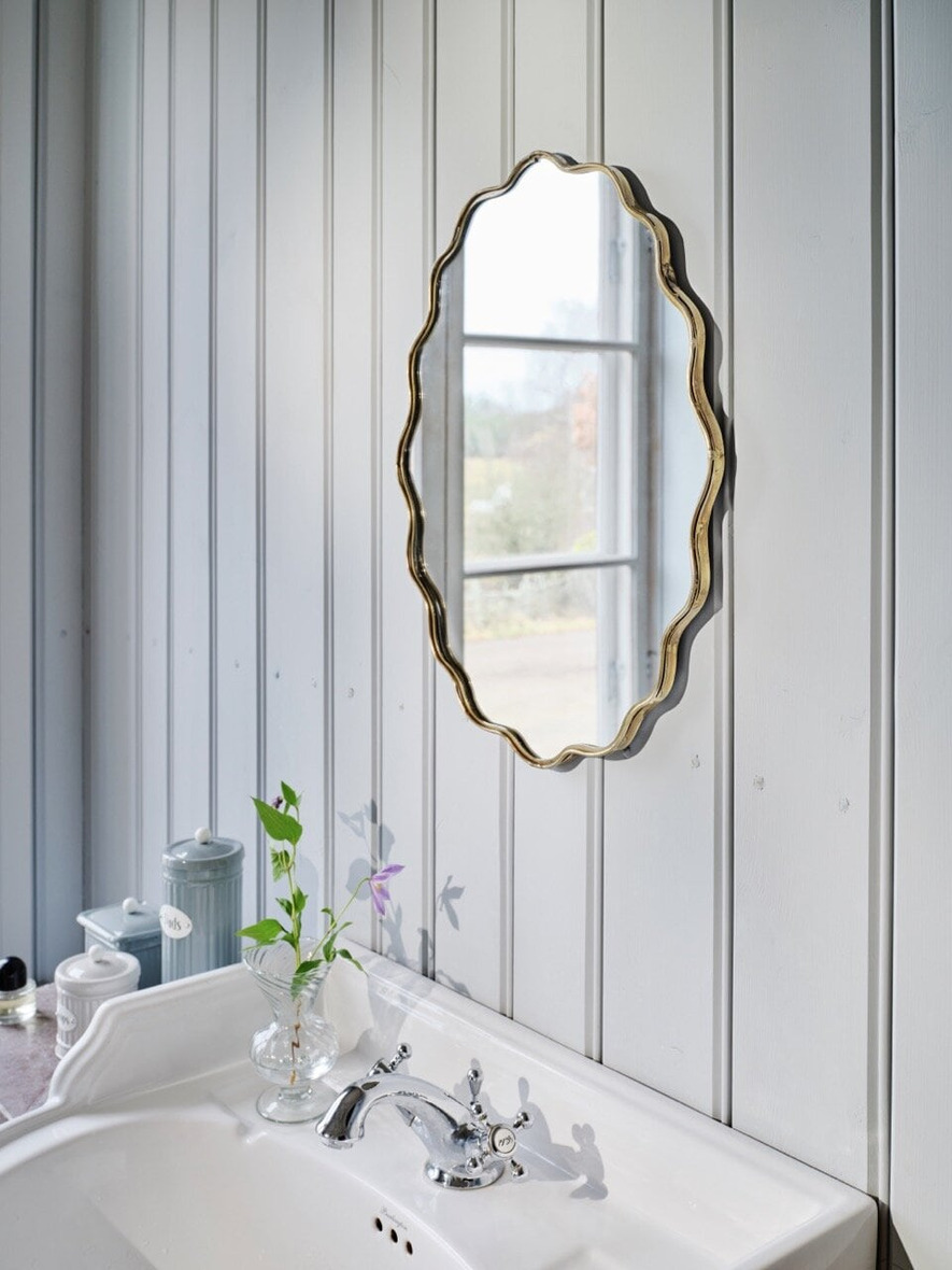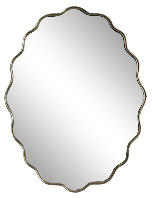 En charmig spegel med dekorativ vågig ram i antikmässing. Den lekfulla formen ger ett mjukt uttryck och passar lika fint i hallen som i sovrummet eller badrummet. Spegeln är en elegant detalj som reflekterar både ljus och stil – och drar blickarna till sig utan att ta över.