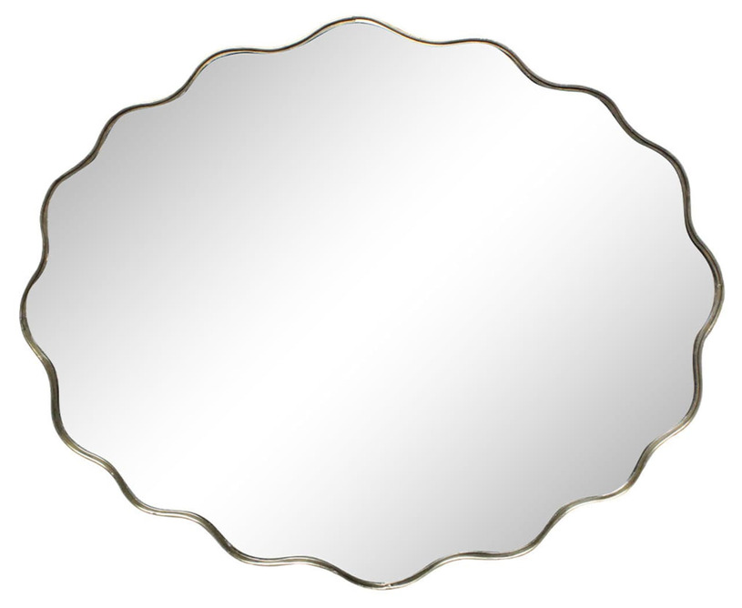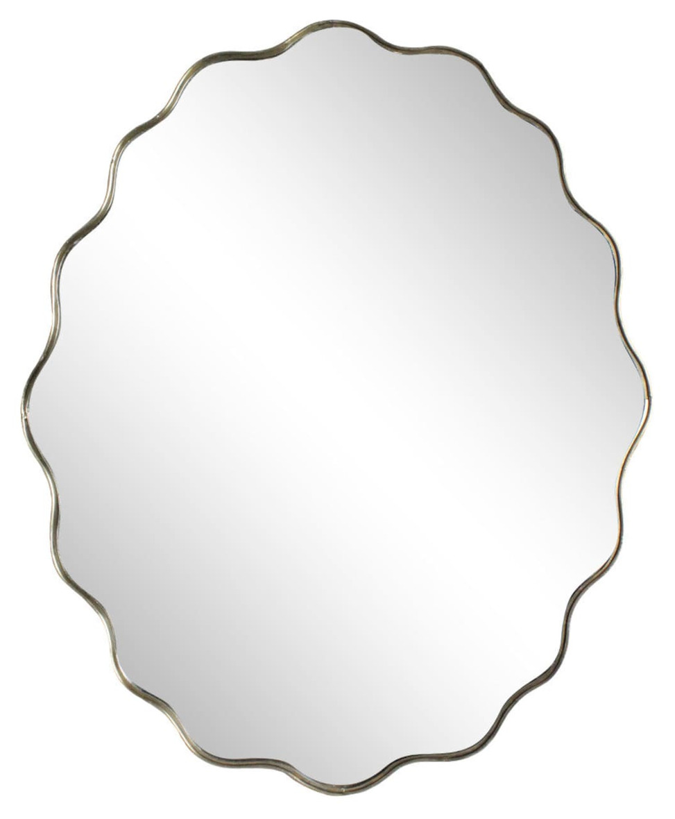 En charmig spegel med dekorativ vågig ram i antikmässing. Den lekfulla formen ger ett mjukt uttryck och passar lika fint i hallen som i sovrummet eller badrummet. Spegeln är en elegant detalj som reflekterar både ljus och stil – och drar blickarna till sig utan att ta över.