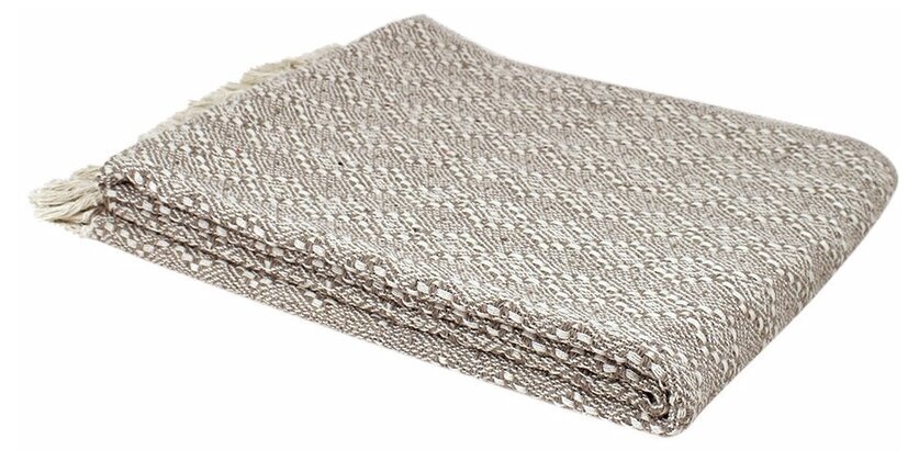 Plädens färg är en mjuk beige, vilket ger ett intryck av enkelhet och neutralitet som gör den lätt att integrera i olika inredningsmiljöer. Kanterna på filten har prydliga tofsar som lägger till en extra dimension av detaljrikedom. Dessa tofsar är omsorgsfullt bundna och placerade längs ena kanten, vilket bidrar till plädens yttre utseende.