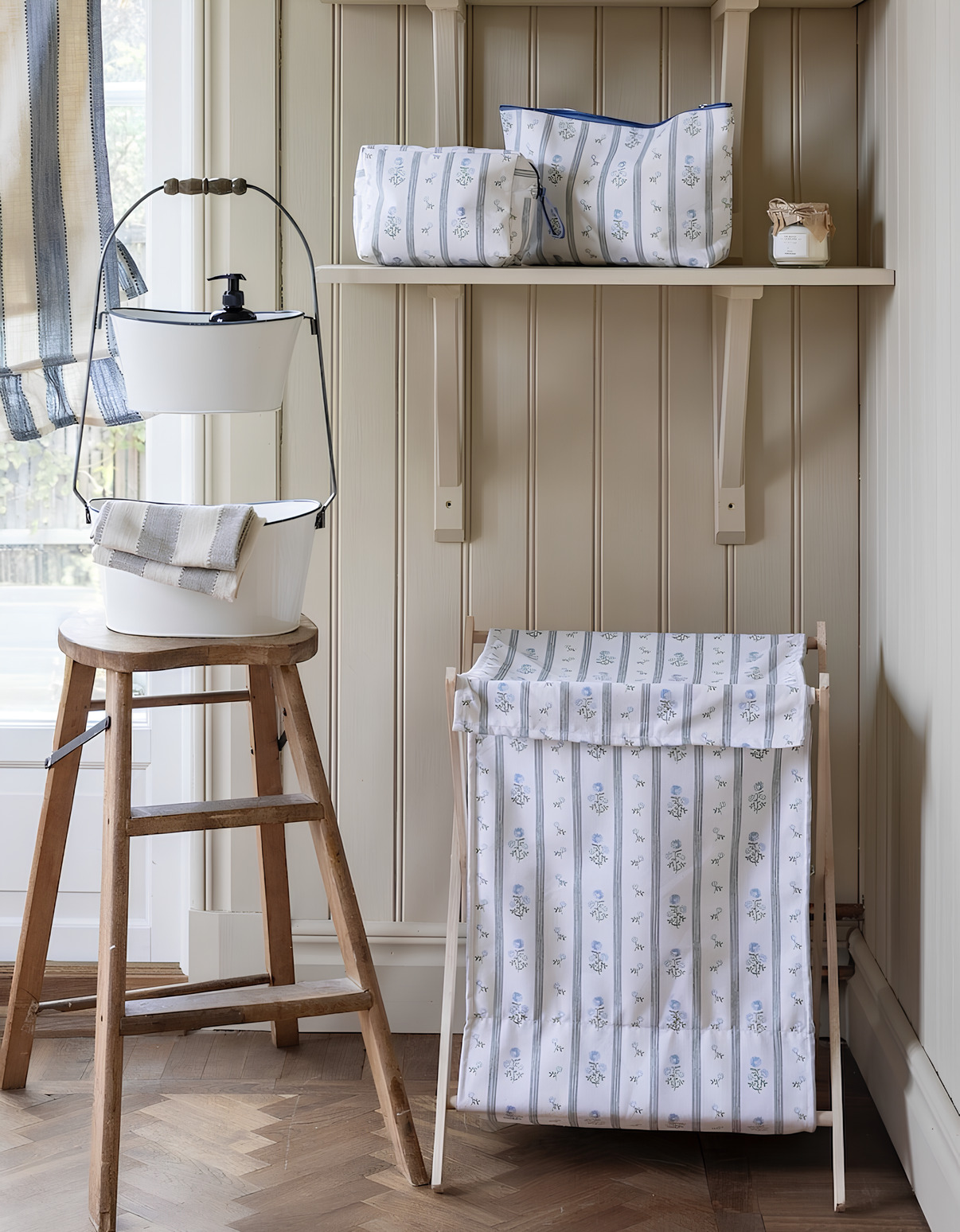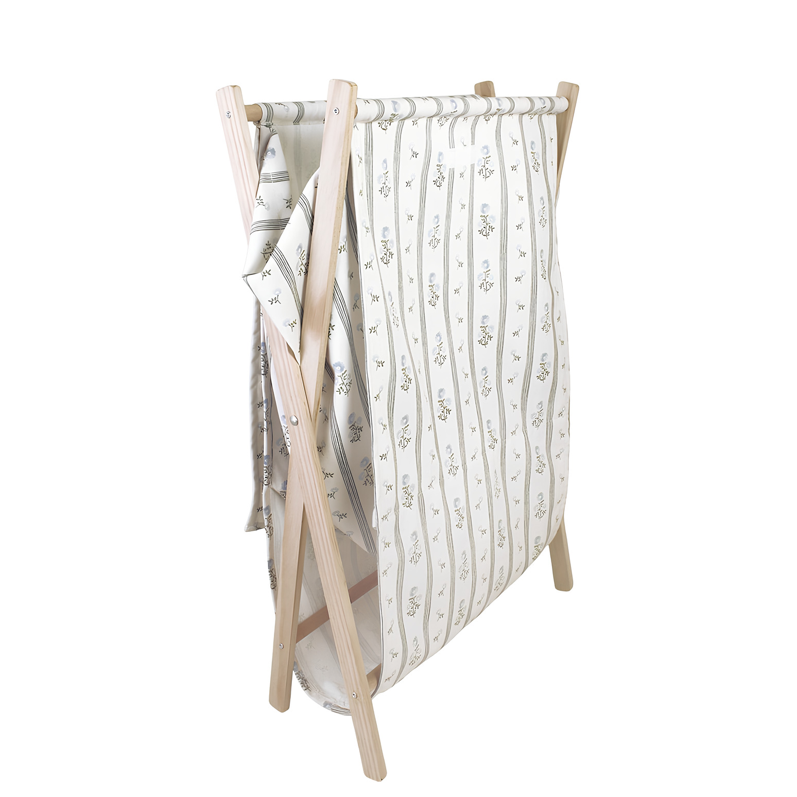 Vacker och praktisk tvättkorg med en mjuk, lantlig känsla. Den blommiga tygpåsen tillsammans med den ljusa träställningen gör korgen till en fin inredningsdetalj i badrum, tvättstuga eller sovrum.