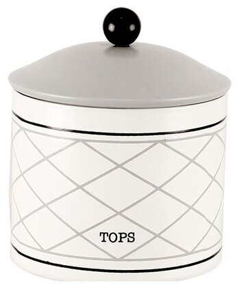 Förvara dina bomullstops i denna fina plåtburk som har vit botten med grå & svarta kontraster.