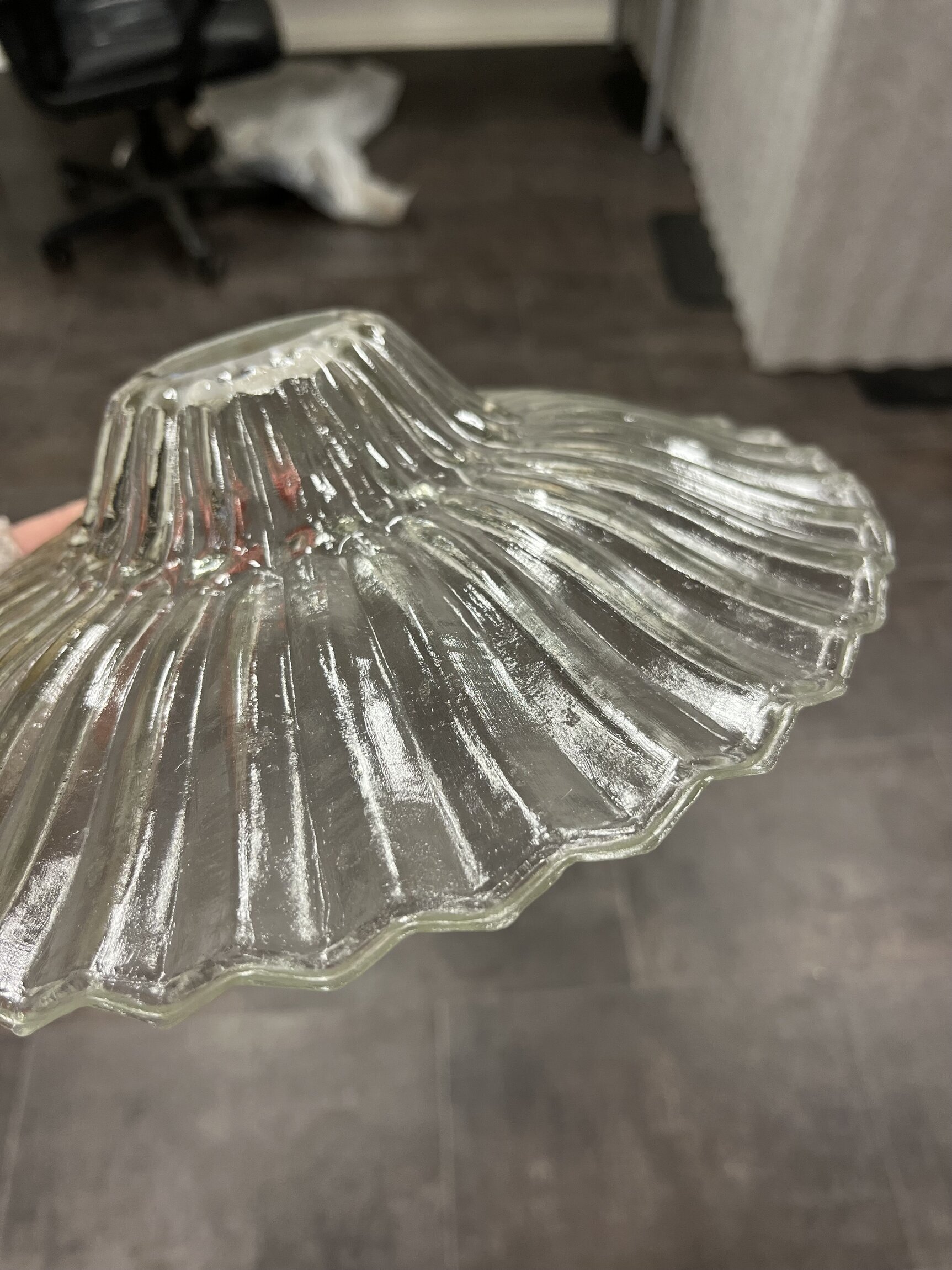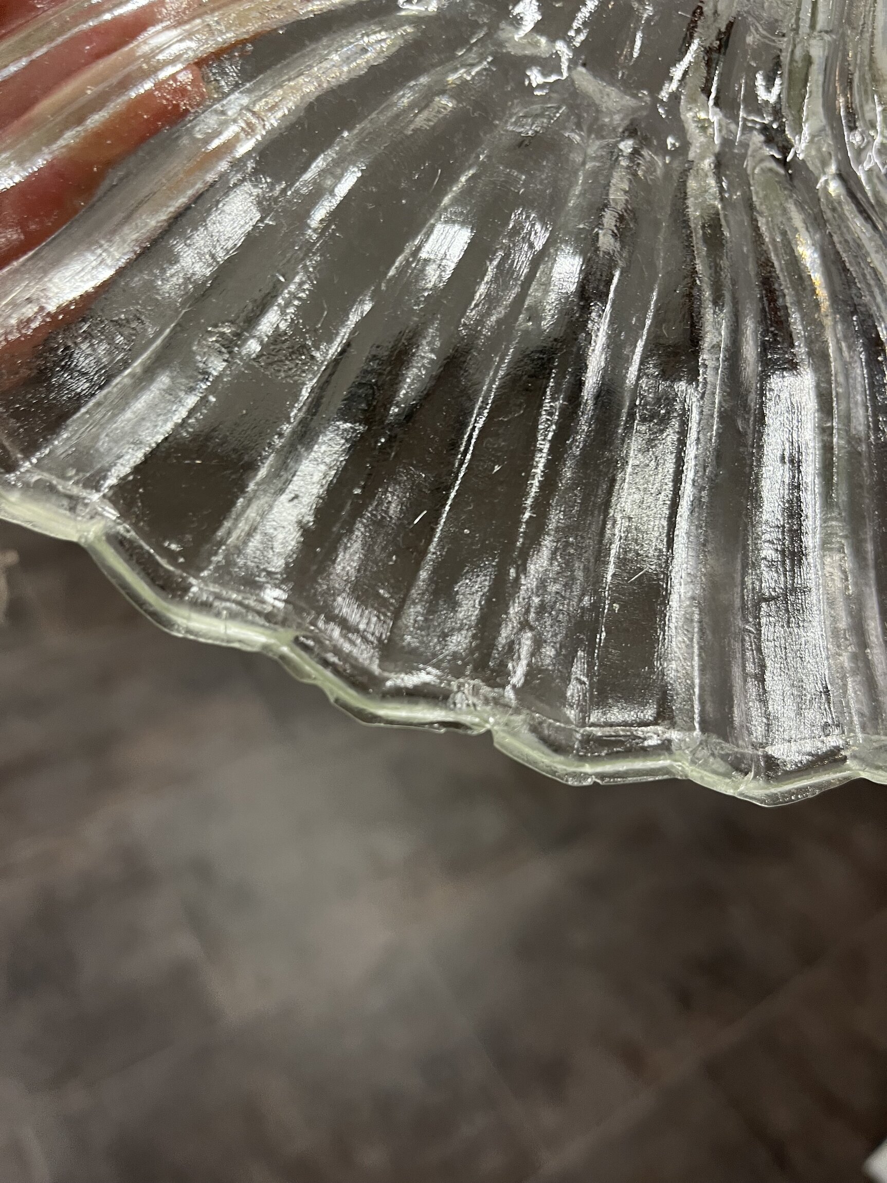 Små, trasiga nagg i glaskupans kanter, knappt synbara om man inte tittar noggrant.