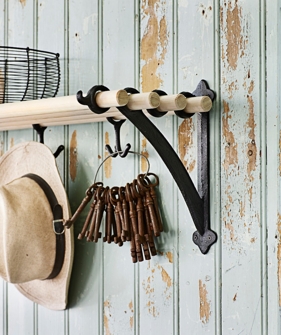 En tidlös hatthylla som kombinerar naturträ med robusta konsoler i svart gjutjärn. Med flera krokar och en stadig stång får du gott om plats för jackor, hattar och accessoarer.