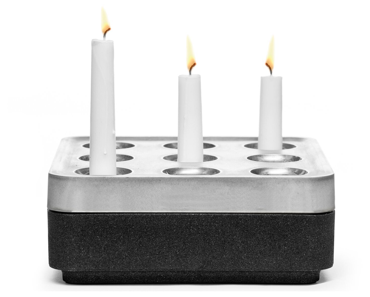 Stumpastaken innehåller tre vita, tända ljus som är placerade i några av urtagen. Ljuslågan ger en varm glöd som kontrasterar vackert mot den annars ganska svala färgpaletten av metall och svart kork. Ljusens vita färg harmoniserar med metallens silveraktiga ton, vilket skapar en ögonblicksbild av enkelhet och funktionalitet.