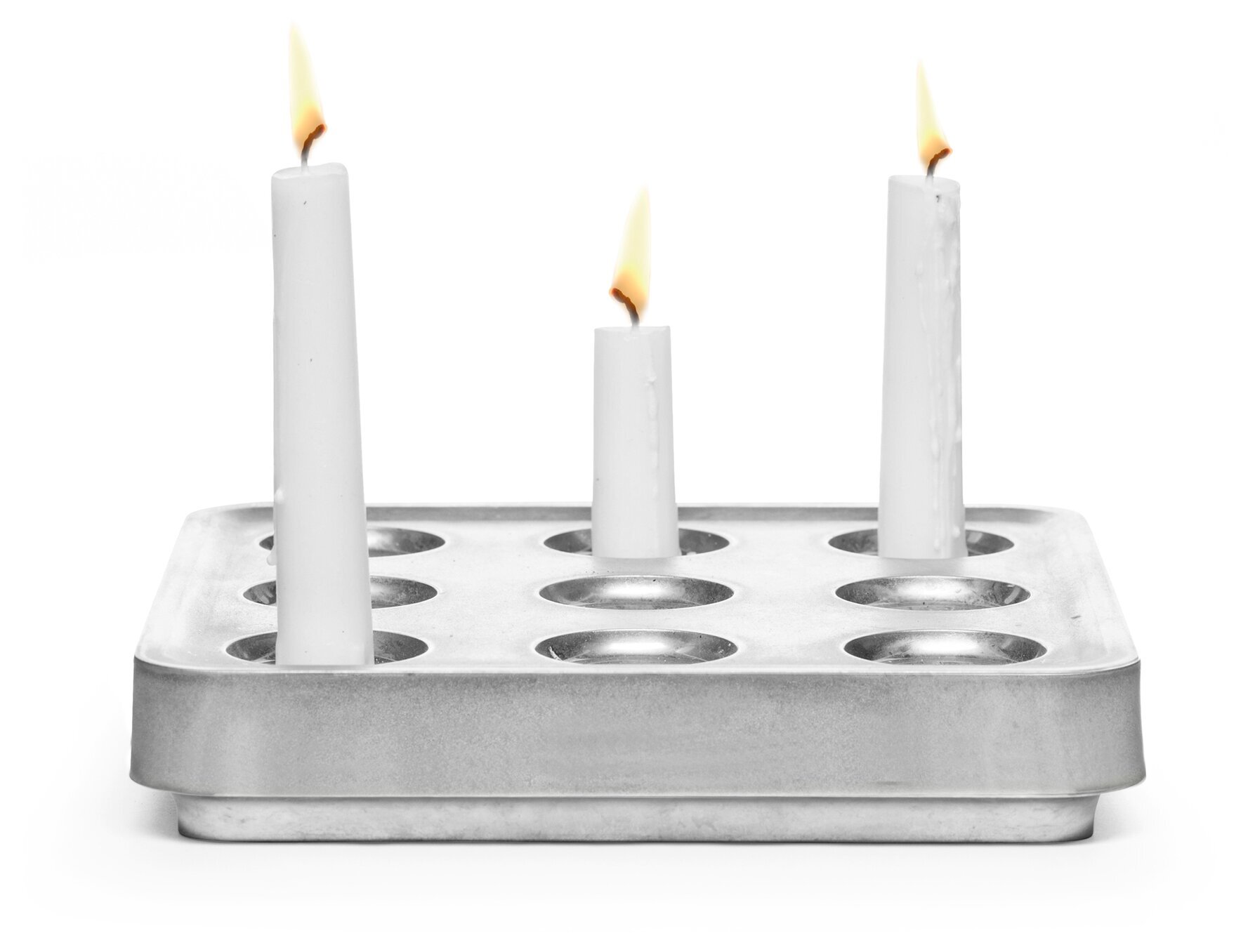 Ljusstaken har en matt, gråaktig yta som reflekterar ett industriellt och robust intryck. Den består av tio cylinderformade hål, jämnt fördelade över ytan, där varje hål är designat för att hålla ett individuellt ljus stadigt på plats. På bilden syns tre ljus, vilka brinner med lugna, gula lågor. Vekarnas sken kastar ett mjukt ljus över metallens yta, vilket skapar en harmonisk kontrast mot den grå bakgrunden.