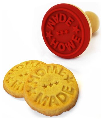 Stämpelns överdel är tillverkad i röd silikon, med upphöjd text och stjärnmönster som enkelt pressas in i degen. Ordet "Homemade" är skickligt framhävt i ett cirkulärt mönster, flankerat av små stjärnor, vilket ger en professionell och handgjord känsla. Handtaget är av ljust trä, vilket bidrar till ett naturligt grepp och är troligen bekvämt att använda när man stämplar kakor.