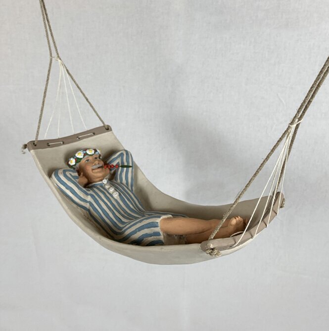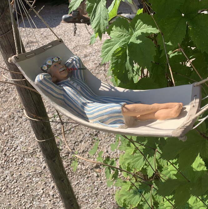 Vacker figurin av Erkers Marie Persson, Karl-Anton i hängmattan. Gjuten i marmorsand & därefter handmålad. Läs mer