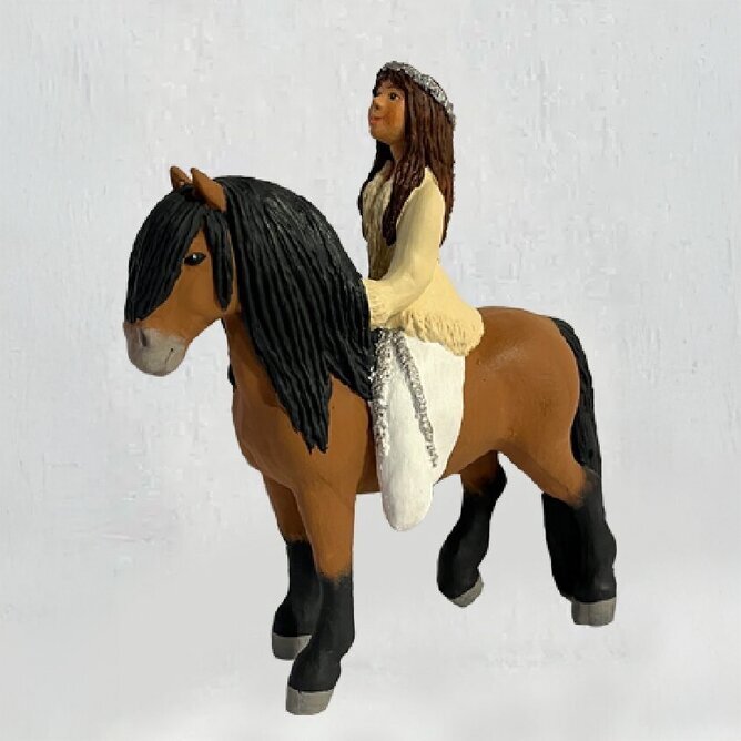 Vacker figurin föreställande en ridande tärna med glitter i håret. Passar fint tillsammans med de små figurinerna i luciatåget.
