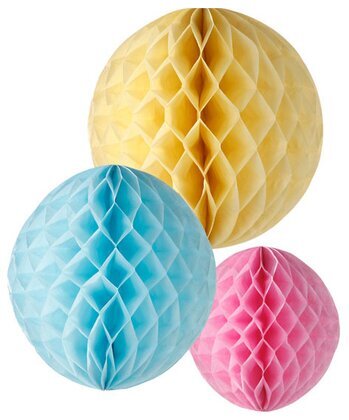 Med dessa Honeycombs som vecklas upp & sätts ihop med ett gem & medföljande sidenband för upphängning kan du göra vilket rum som helst klart för kalas eller fest. Perfekt att använda till bröllop och andra stora festligheter eller varför inte dekorera med dessa till barnkalaset eller ute i trädgården. Förpackningen innehåller 3 stycken i olika färger.