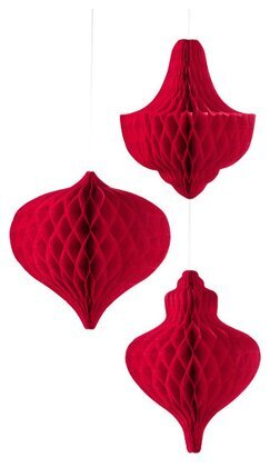 Bilden från Köpstaden.se visar tre dekorativa pappersdekorationer i olika former, alla i en intensiv röd färg. Dessa dekorationer ingår i produkten Honeycombs Röd från varumärket Talking Tables och utgör ett perfekt inslag för att skapa stämningsfulla inslag vid olika tillställningar.