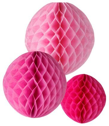 Den andra bollen, som också är ljusrosa men med en något starkare färg, är belägen nedanför och till höger om den första. Även denna boll följer samma sexkantiga mönster, vilket är karakteristiskt för hela serien. Ytan är matt och pappersmaterialet är lätt och luftigt, vilket gör bollarna enkla att hänga upp eller arrangera i rum för att skapa en festlig atmosfär.