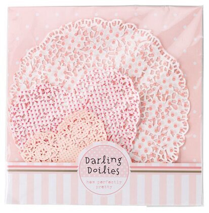 På förpackningens framsida finns även en etikett med texten "Darling Doilies", som ytterligare förstärker den charmanta framtoningen. Under etiketten finns en randig sektion i rosa och vitt, vilket ger designen en nostalgisk och något vintageinspirerad känsla.