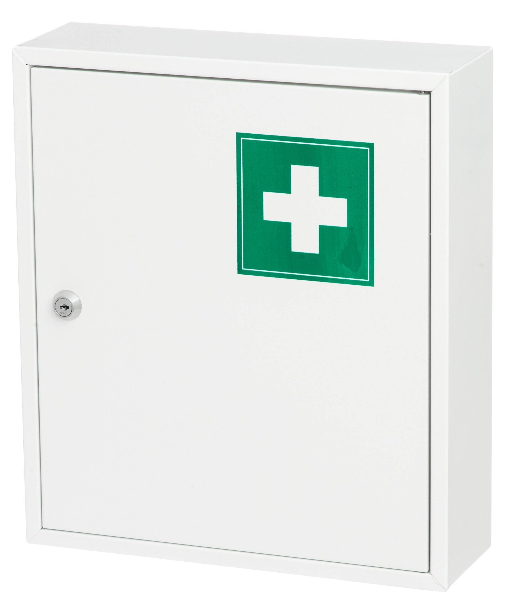 På framsidan av skåpet finner man en tydlig symbol, ett grönt kors mot en vit bakgrund, vilket omedelbart indikerar dess syfte som förvaringsplats för första hjälpen-utrustning. Denna märkning är centraliserad och drar omedelbart till sig uppmärksamheten, vilket gör skåpet lätt att identifiera i en nödsituation.