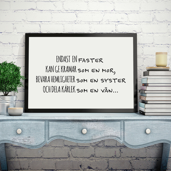 Texten på postern fångar ögonen med sitt tydliga, svarta typsnitt mot en vit bakgrund. Den uttrycker kärleksfulla ord om den unika och speciella relationen som en faster kan ha. Budskapet är enkelt men kraftfullt, och det passar perfekt in i en klassisk eller modern inredning.