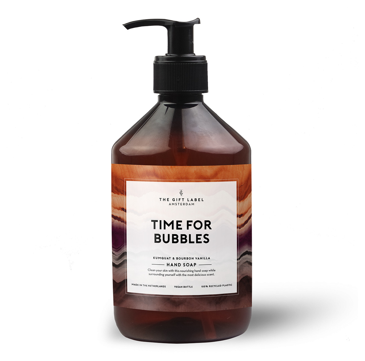 I bilden syns en handtvål med namnet Time For Bubbles, tillverkad av The Gift Label, en del av det varierade sortiment som erbjuds av Köpstaden.se. Förpackningen är en brun plastflaska, tillverkad av återvunnen plast, vilket framgår av texten på etiketten. Flaskan har en praktisk pump upptill för enkel dosering.