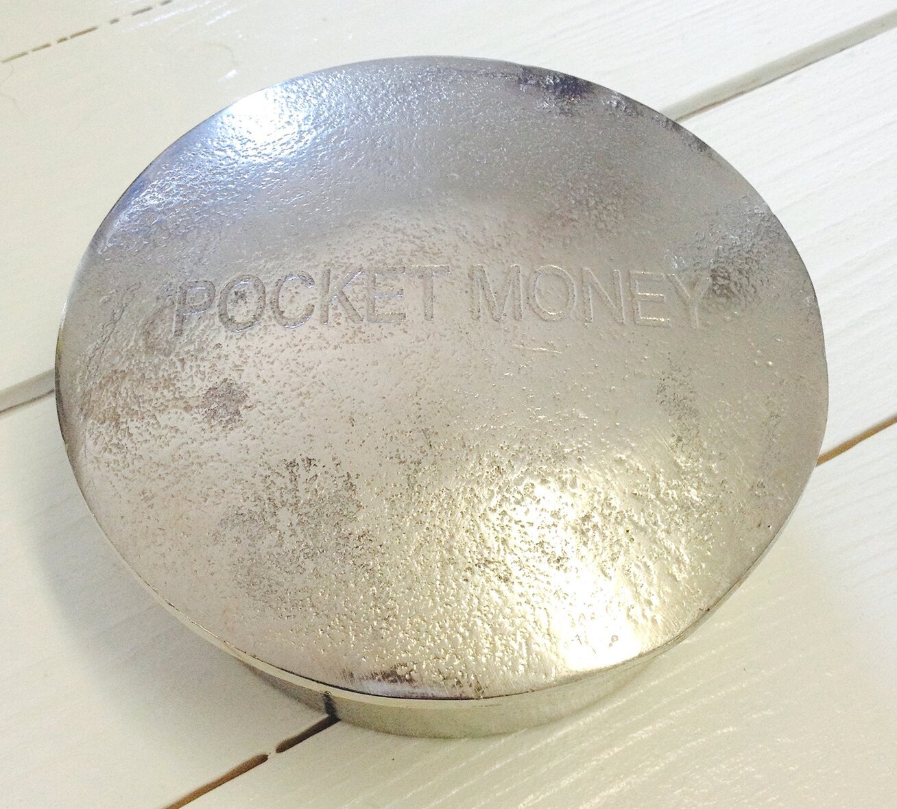 Nu kan du enkelt hålla koll på dina småmynt och du slipper ha dem skramlandes i väskan eller i fickorna, samtidigt som du får en snygg inredningsdetalj. Denna runda ask/box i metall med lite sliten & rustik stil med texten Money på locket. Undersidan har en mjuk filt så det ej blir repor på bord och annat. Matchas gärna ihop med ask/box med texten Keys.