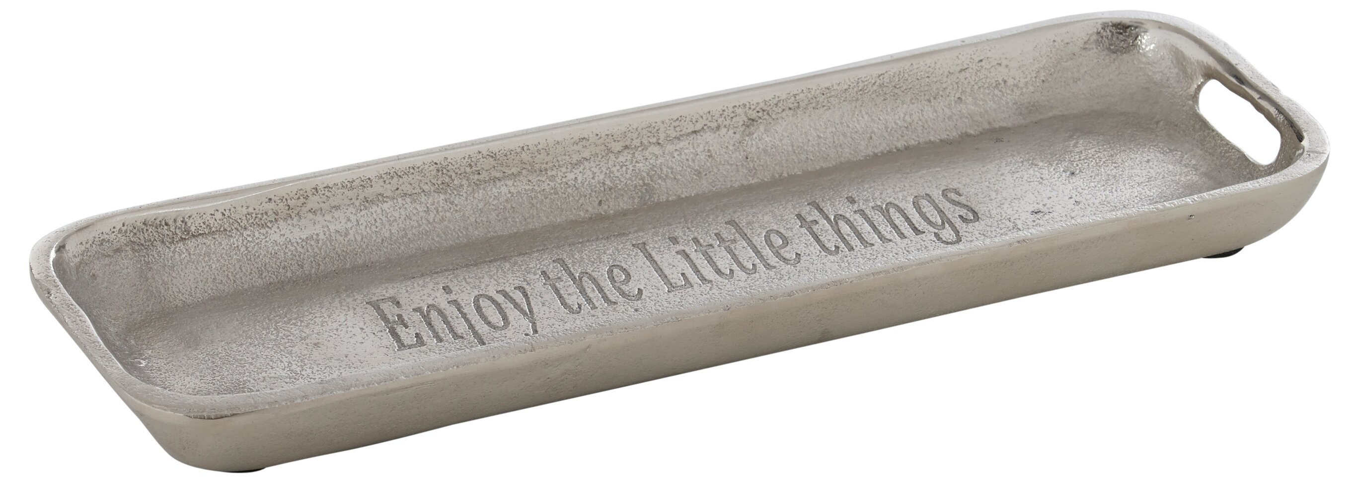 Brickan är tillverkad i ett metalliskt material med en subtil glans, vilket ger den ett modernt intryck. Ytan är något texturerad med små, oregelbundna prickar som ger en känsla av hantverk och detaljrikedom. I mitten av brickan finns den ingraverade texten "Enjoy the Little Things". Dessa ord är placerade i mjukt rundad typografi, som förstärker den varma och inbjudande känslan av produkten.