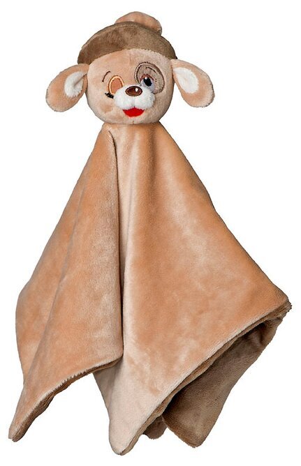 Snuttefilten har en varm, ljusbrun nyans som ger ett mjukt och dämpat intryck. Ytan ser mycket mjuk ut, perfekt för känsliga kinder och små händer att hålla om. Den fyrkantiga filten verkar vara gjord av ett plyschliknande material som ger en inbjudande textur, vilket gör den idealisk för gosiga stunder.