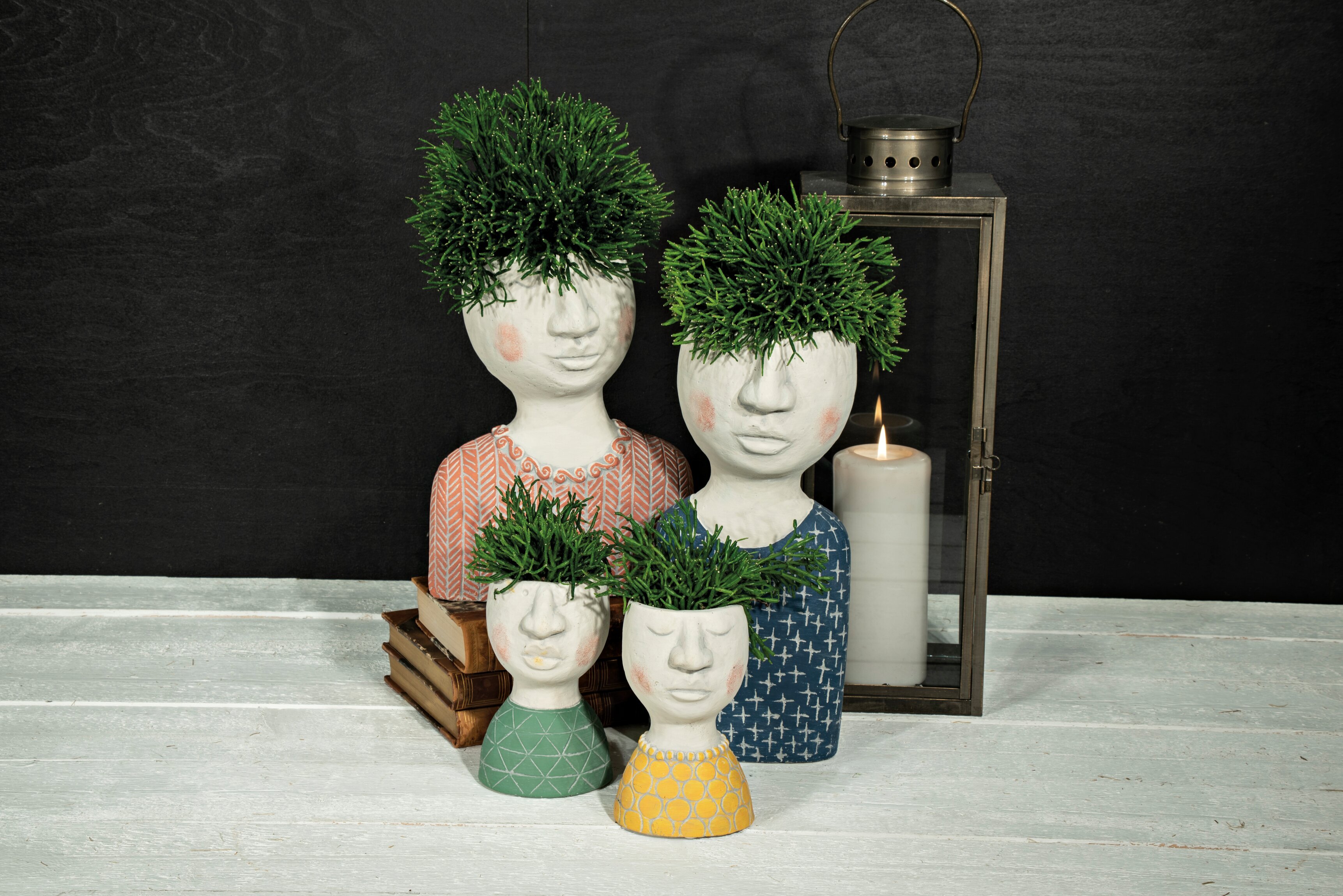 I bilden står fyra krukor i olika storlekar och färger. De är formade som huvuden där växterna representerar "hår". Varje kruka har sin egen unika stil och karaktär. Den största krukan står längst bak till vänster, klädd i ett mönster av varma, rosa toner, medan den bredvid har ett djupblått mönster med vita kors. Båda dessa krukor har runda, mjuka ansiktsdrag med lätt rödtonade kinder, vilket ger dem ett lekfullt uttryck.