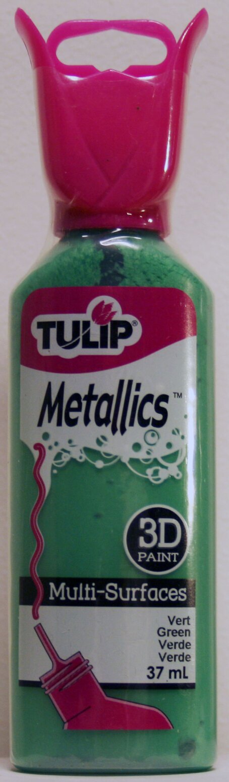 Bilden från Köpstaden.se visar en flaska med en klar och livfull grön nyans. Produkten är en del av varumärket Tulip och är känd som Tulip Metallic 3D - Grön. Flaskan rymmer 37 ml och är avsedd för att skapa tredimensionella effekter på olika ytor.