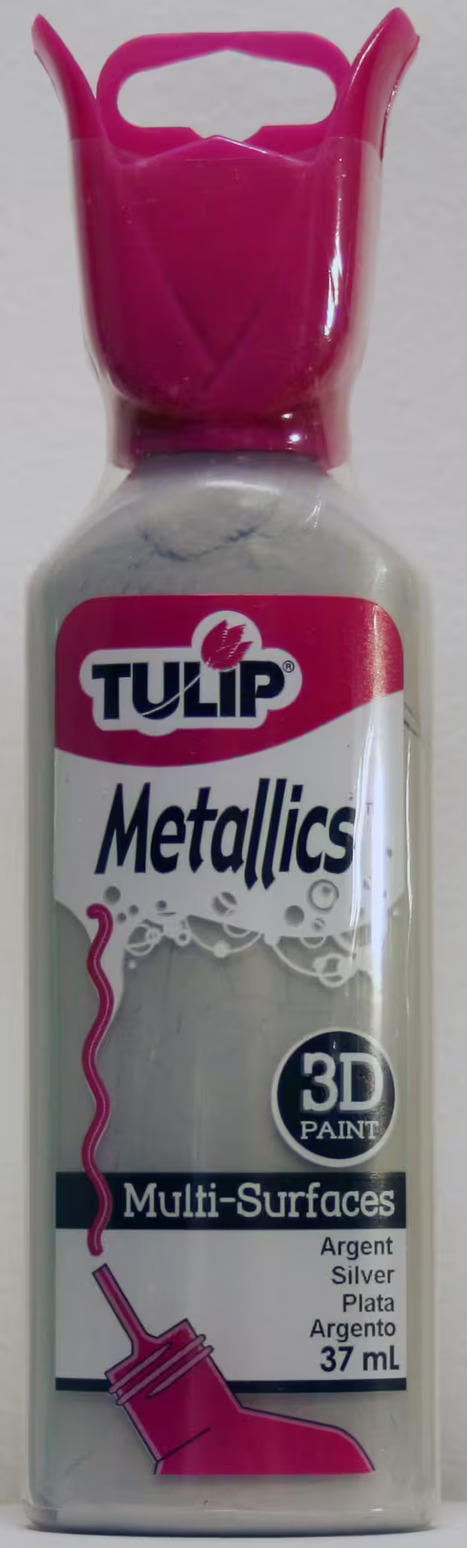 Bilden visar en flaska som innehåller en produkt från Köpstaden.se, en butik som erbjuder ett brett sortiment av diverse produkter för olika vardagsbehov. Produkten är en 3D-färg, känd under namnet Tulip Metallic Silver, och tillhör varumärket Tulip, vilket är specialiserat på material för kreativa projekt.