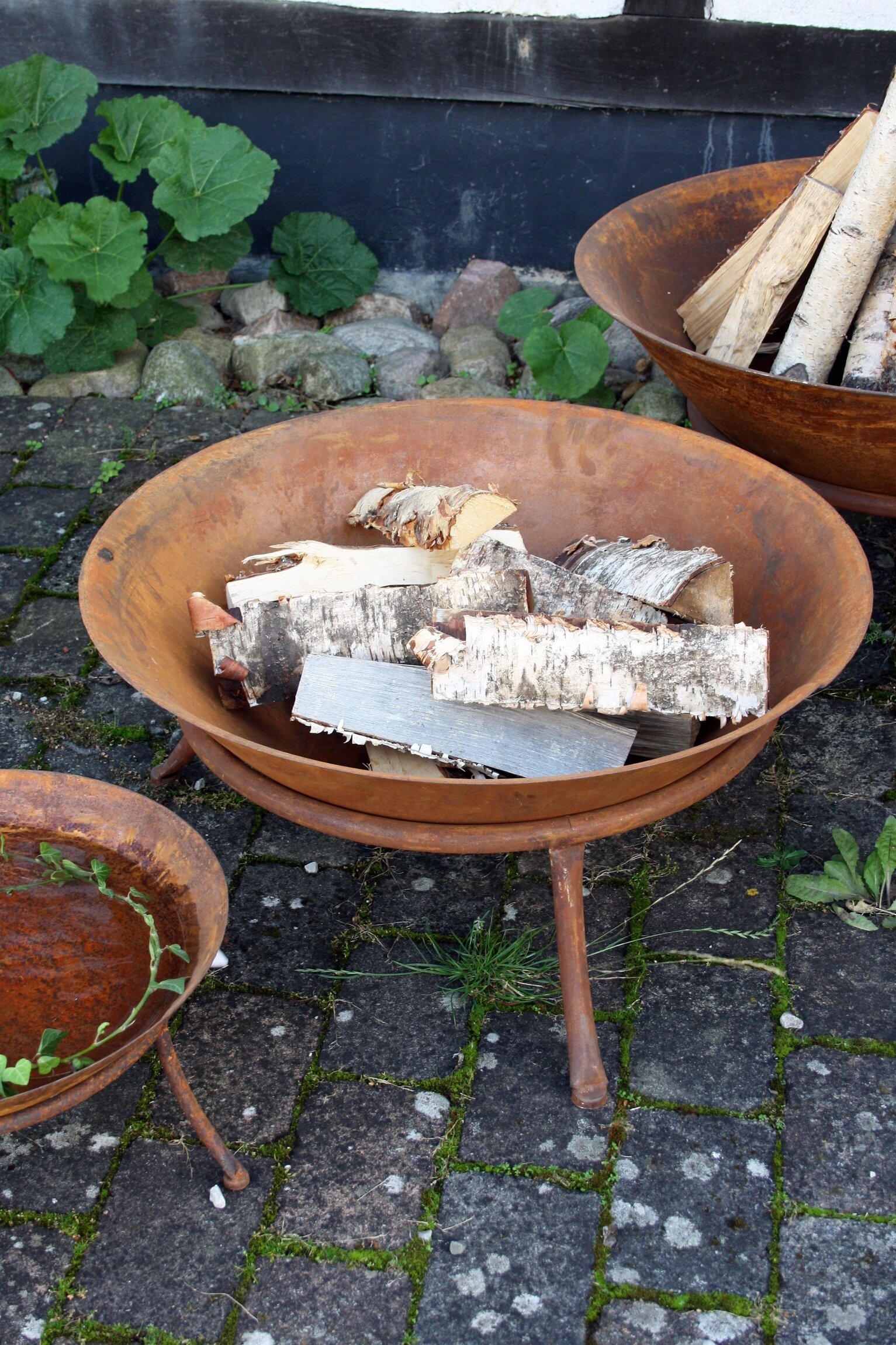 På bilden syns en utomhusmiljö där vi ser flera eldfat från Västanvinden, ett populärt varumärke som går att hitta på Köpstaden.se. Eldfaten står på en stensatt yta, där mossan friskt växer mellan stenarna, vilket ger en naturnära känsla. Dessa faten är tillverkade i rostigt material, vilket ger dem en rustik och tidlös estetisk karaktär. Det större eldfatet har en diameter på 75 cm och en höjd av 34 cm. Detta rymliga fat är fyllt med bitar av ved, där man tydligt kan se de ljusa björkstammarna med sin karakteristiska bark.