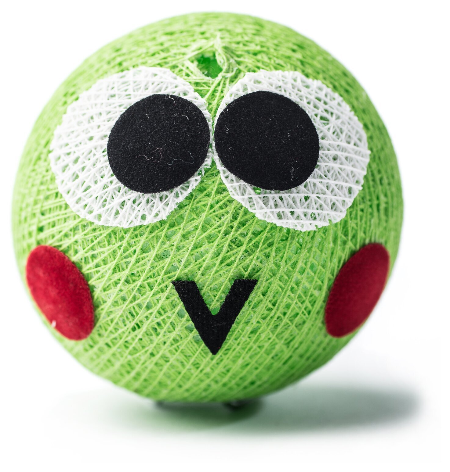 Bollens yta är täckt av tunna trådar, kors och tvärs i ett invecklat mönster som ger produkten en både robust och sofistikerad känsla. På bollens framsida finns två stora, runda och iögonfallande ögon. Dessa är placerade bredvid varandra och är täckta av ett tunt, vitt nätmaterial med svarta cirklar i mitten, vilket ger ögonen ett uttrycksfullt och lekfullt utseende.