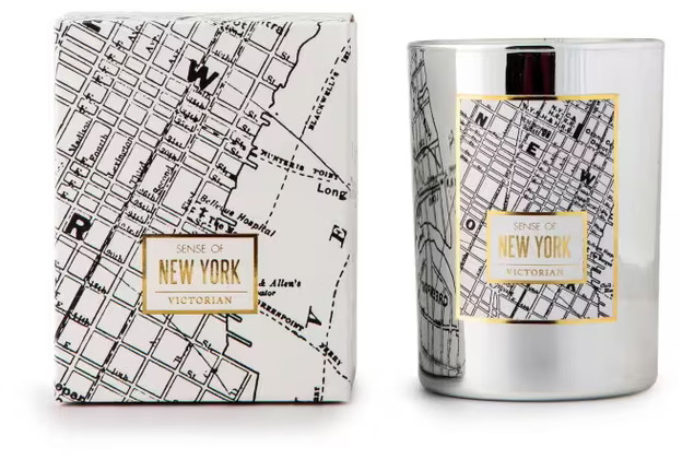 Själva ljuset, som står bredvid förpackningen, har en blank, silvrig yta vilket ger ett reflekterande sken. På ljusets framsida finns en ruta med samma kartmotiv som på förpackningen, vilket skapar en sammanhängande och genomtänkt design. Inom denna ruta finns texten 'Sense of New York Victorian' tryckt i en elegant guldton, vilket ger en subtil kontrast mot den annars svala färgpaletten.