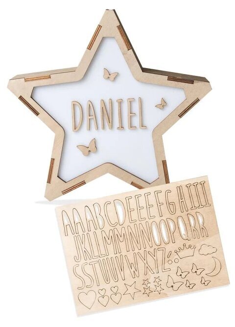 LED-lampa utformad som en stjärna där du kan skriva ditt namn med de medföljande bokstäverna samt dekorera med bl a hjärtan, stjärnor, krona & moln mm. Bokstäver & dekorationer har självhäftande tejp & fästs enkelt på själva lampan.