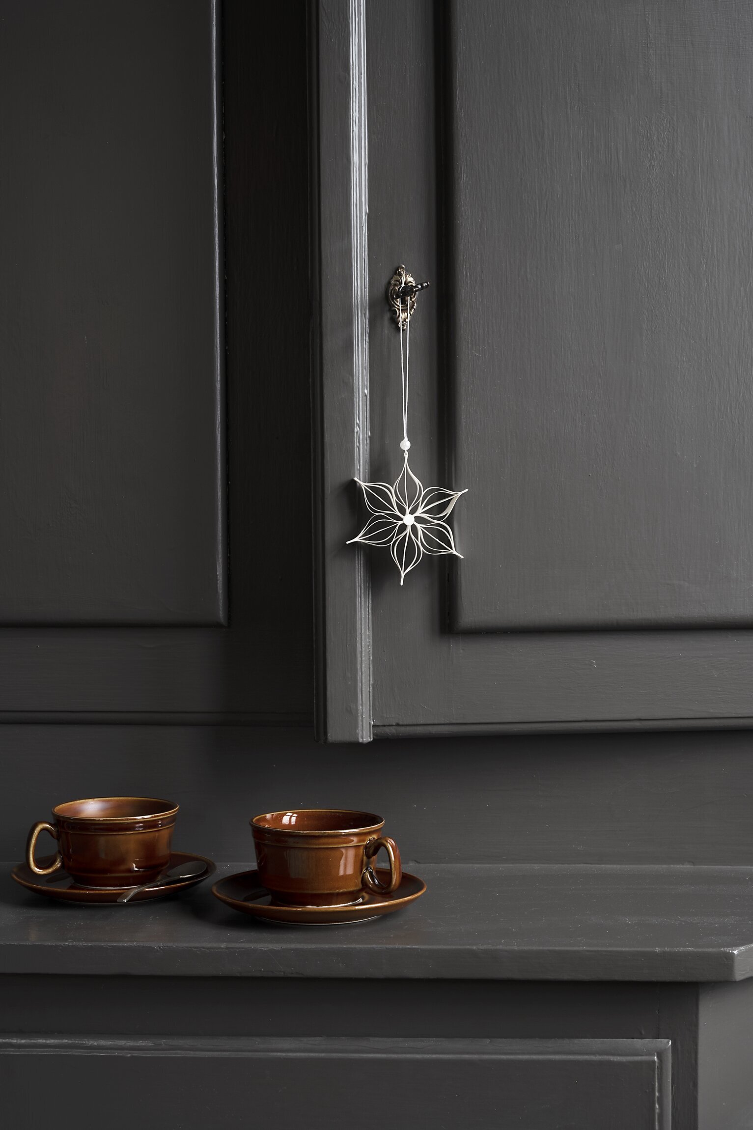 Bilden från Köpstaden.se visar en stämningsfull uppsättning inomhus, som förmedlar en känsla av lugn och harmoni. På bilden syns ett skåp i en djup, mörkgrå ton, vilket ger en dramatisk och ändå sofistikerad bakgrund. Centralt hänger Dekoration Stjärna från varumärket Watt och Veke. Stjärnan är elegant formad med ett sirligt mönster, vilket framhävs mot det sobert målade skåpet. Den är fäst med en fin tråd, som förenar det moderna med det klassiska på ett ypperligt sätt.