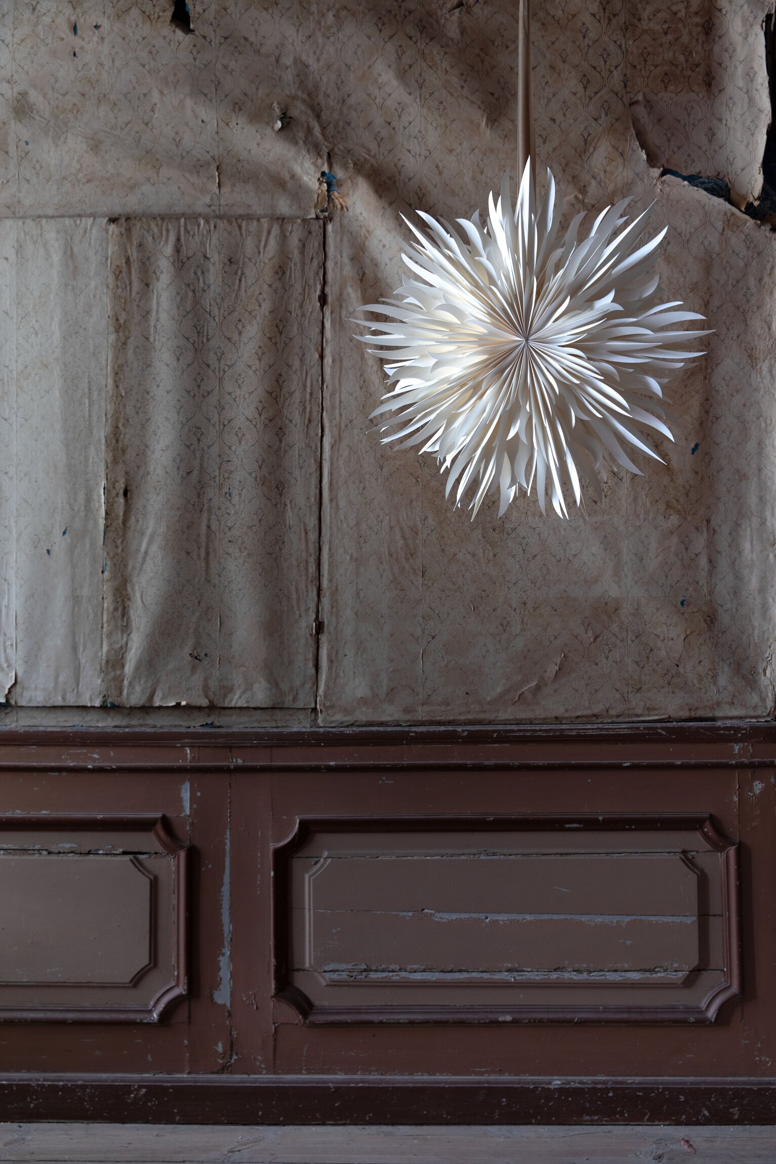 Helvit julstjärna i ett folkloristiskt utförande med detaljer som liknar lågor från Watt & Veke. Levereras i en vit elegant förvaringsbox så julstjärnan håller sig fin år efter år. Sladd med strömbrytare köps separat.