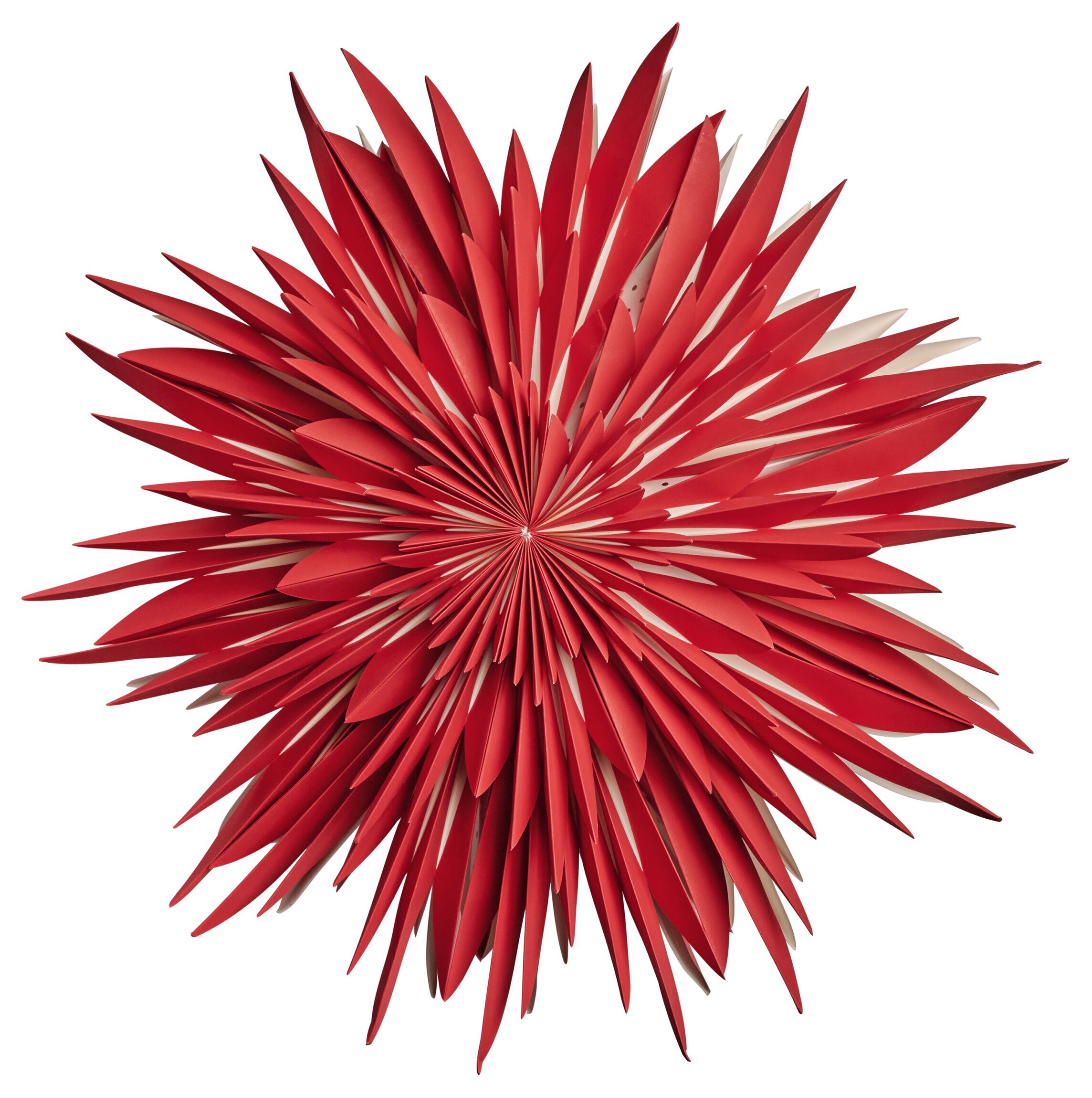 Bilden är tagen med tydlig skärpa, vilket gör att varje detalj i papperets vikningar och färgövergångar kan uppskattas. Den vita bakgrunden ger en stark kontrast, vilket betonar stjärnans livfulla färg och dess skiktade design. Detta gör att "Julstjärna Maja 60 Röd" verkligen framträder i all sin prakt.