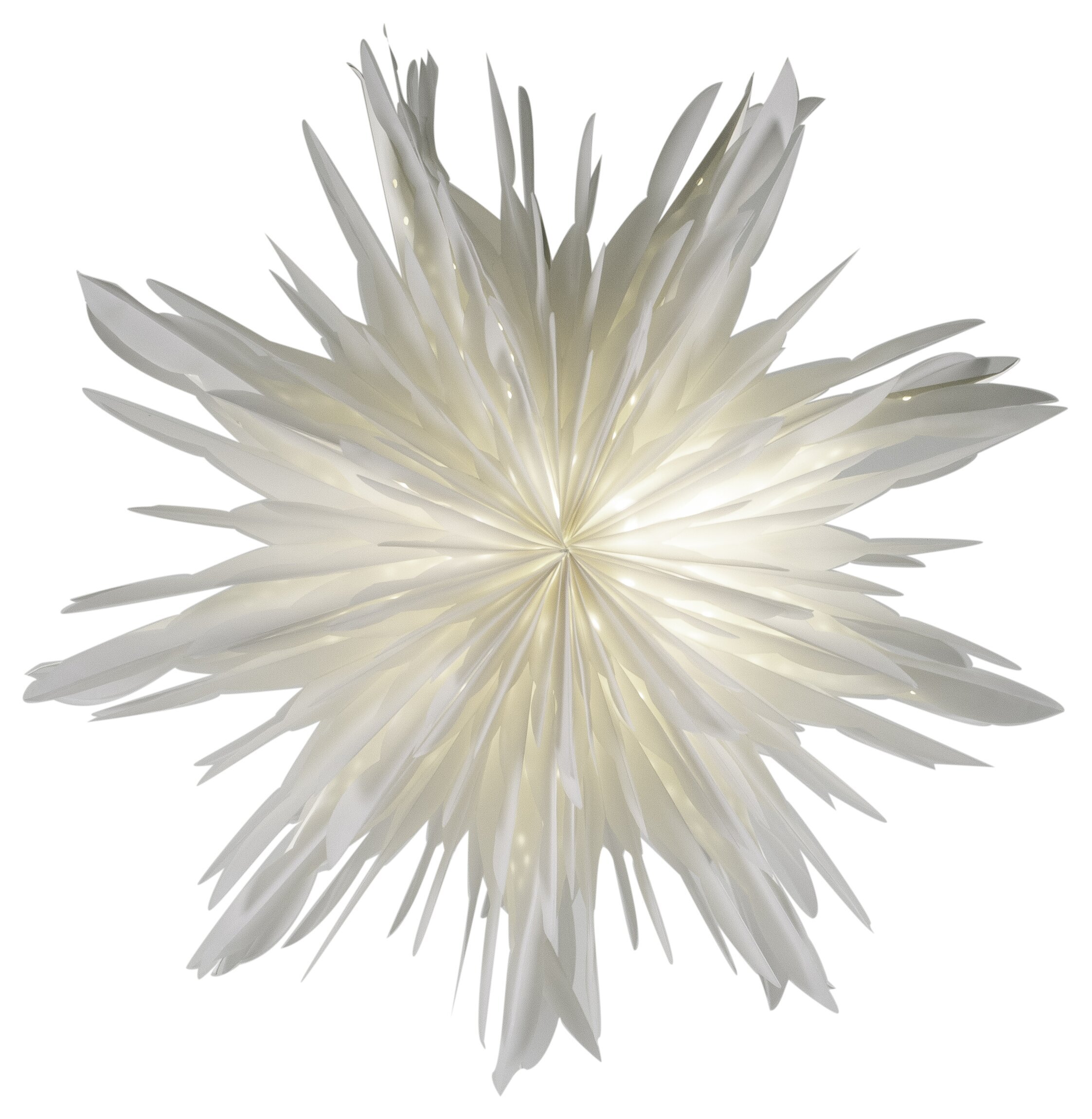 I mitten av stjärnan möts de vita pappersbladens spetsar i en välordnad struktur, vilket skapar en harmonisk och centrerad punkt. Papperets textur är delikat, vilket syns tydligt i den mjuka belysningen som filtreras genom materialet, vilket ger ett subtilt och milt ljus. Ljuset sprider sig jämnt ut mot spetsarna och förstärker känslan av lugn och balans.