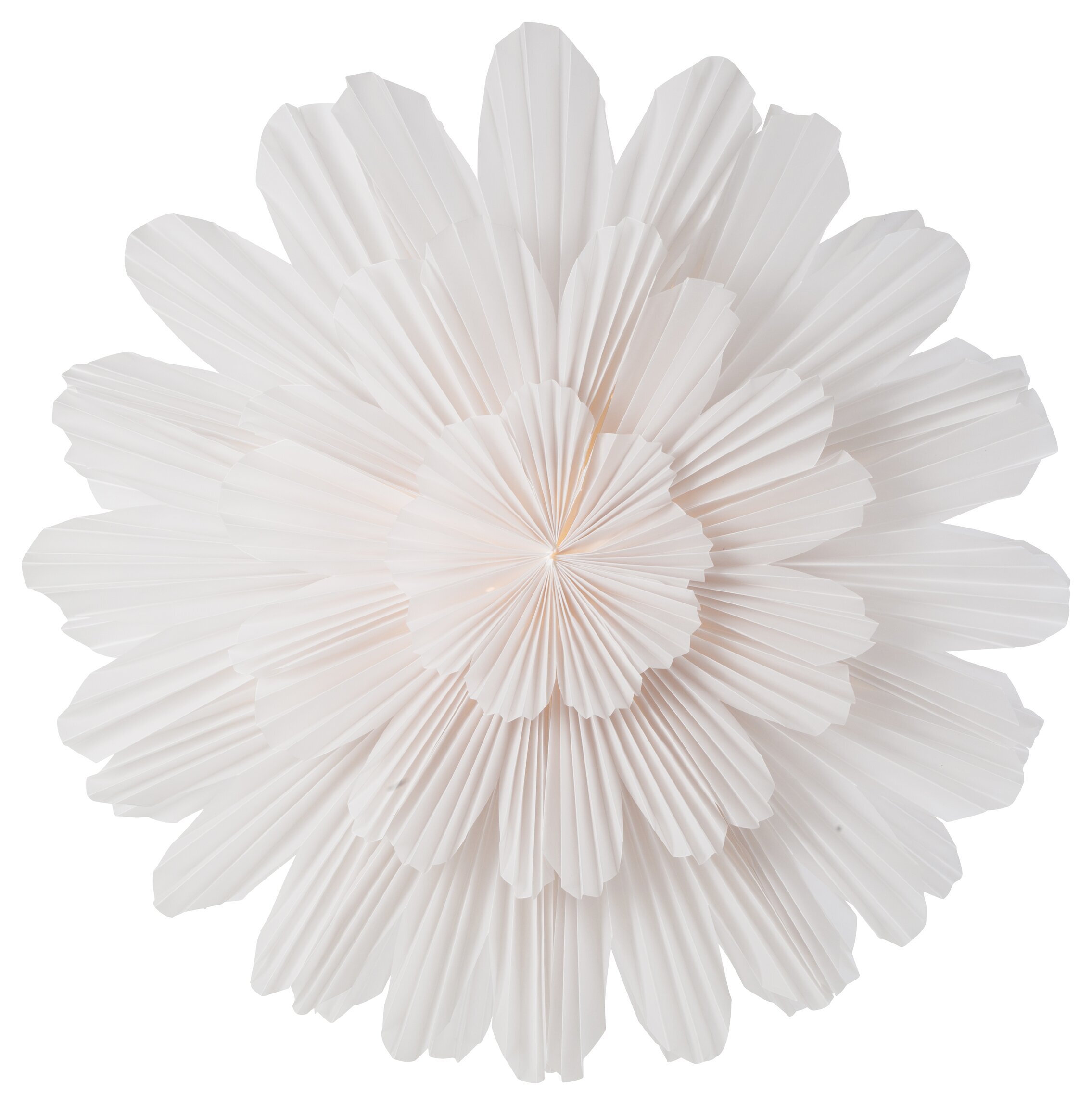 På fotot syns en stjärna med en imponerande tredimensionell form, skapad av flera lager veckat papper. Papperet är vikt i symmetriska, harmoniska mönster som formar en central cirkulär design, vilket ger ett visuellt intryck av en blommande snöflinga. Färgen är en ren, vit nyans som fångar ljuset på ett sätt som framhäver vikningarnas djup och detaljer.
