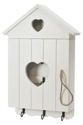 Detta nyckelskåp är tillverkat i trä och har en vit yta som ger ett rent och neutralt intryck, vilket gör det lätt att integrera i olika typer av heminredningar. Skåpets form är inspirerad av ett traditionellt hus, vilket förstärks av det upphöjda taket som bildar en trekant. På framsidan av skåpet finns ett utskuret hjärtformat mönster, både i mitten av dörren och i den övre delen, vilket tillför en charmig och personlig touch. Dessa hjärtformer fungerar dels som dekorativa element, dels som ett sätt att ge en glimt av innehållet inuti, genom att öppna ett litet, inbjudande fönster.