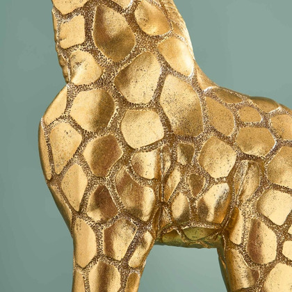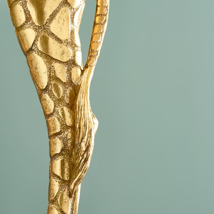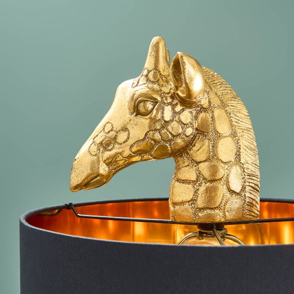 Ge ditt hem en touch av lekfull elegans med denna unika golvlampa i form av en giraff. Den detaljerade designen i gyllene finish skapar ett lyxigt intryck, samtidigt som den svarta lampskärmen tillför en stilren kontrast. Perfekt som ett iögonfallande statement i vardagsrummet, hallen eller kontoret.