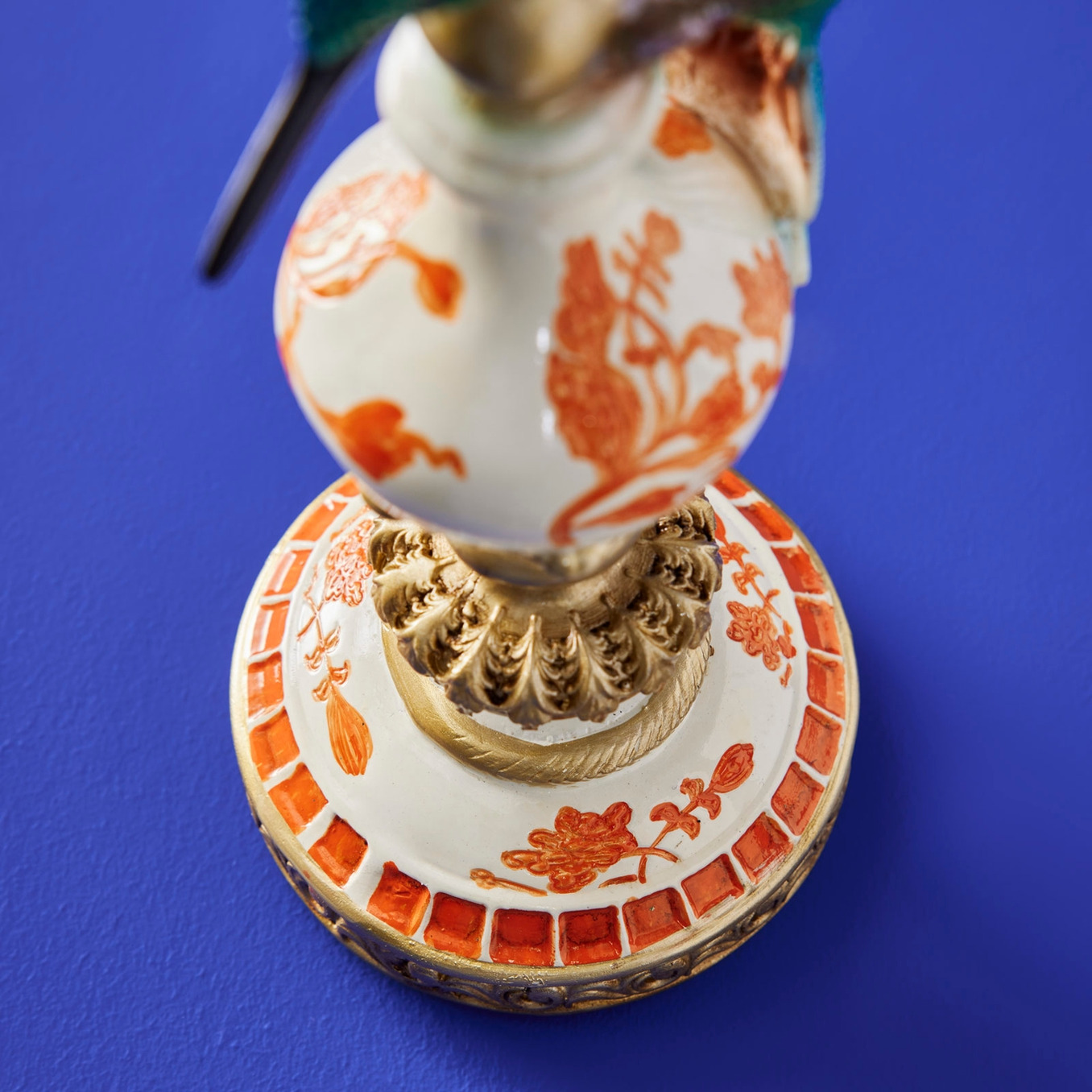 Dekorativ ljusstake med fantasifull karaktär. Den detaljrika kolibrin sveper elegant runt den ornamenterade foten och skapar ett uttryck som känns både levande och sofistikerat. Med skimrande toner i grönt, turkost och mjukt rosa, tillsammans med gyllene detaljer och klassiska mönster, blir denna ljusstake en verklig blickfångare i hemmet.