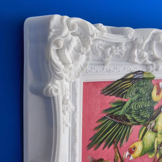 Bilden visar ett konstverk som strålar av färg och detaljer, vilket är typiskt för Werner Voss produkter som finns hos Köpstaden.se. Fokus ligger på ramen till tavlan Coco, som är skapad med omsorg och precision. Ramen uppvisar en rik, ornamenterad design med intrikata mönster. Dessa utsmyckningar består av virvlande mönster och blomstermotiv, vilket ger ett intryck av noggrant hantverk. Ramen är tillverkad i en klassisk vit nyans, vilket skapar en vacker kontrast mot väggens blå bakgrund.